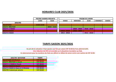 Horaires et Tarifs Adultes Club 2025-202
